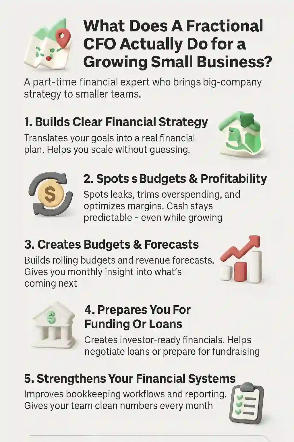 Fractional CFO services give growing businesses access to strategic financial leadership without a full-time hire. They help clarify cash flow, improve forecasting, strengthen reporting, and guide smarter decision-making. For many small businesses, it's the fastest way to gain financial clarity, reduce uncertainty, and build a stronger path for long-term growth.